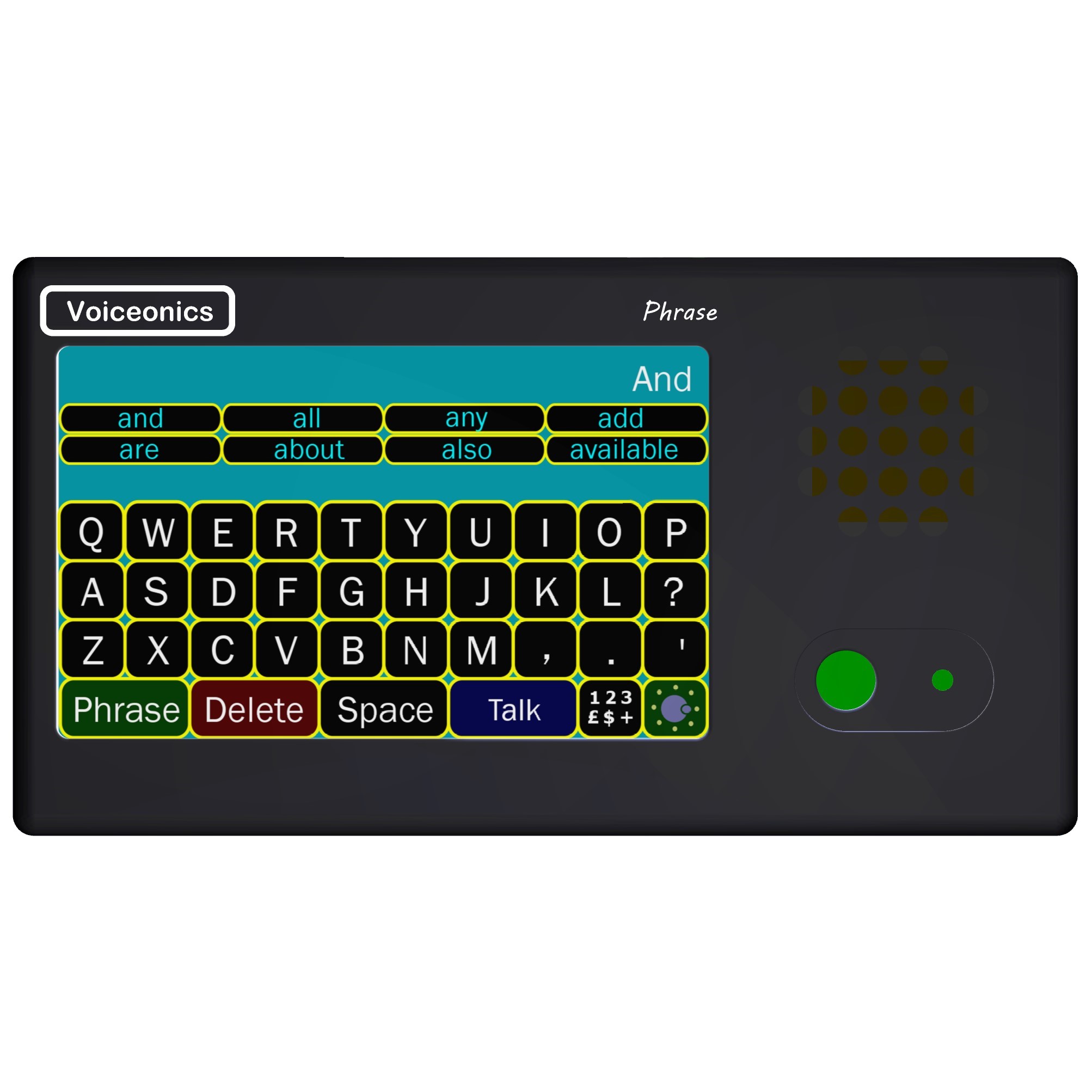 Text-to-speech communication aid. Comprises: large keyboard with large keys; predictive text; 'Talk' key speaks the text; phrase feature enables pre-p...